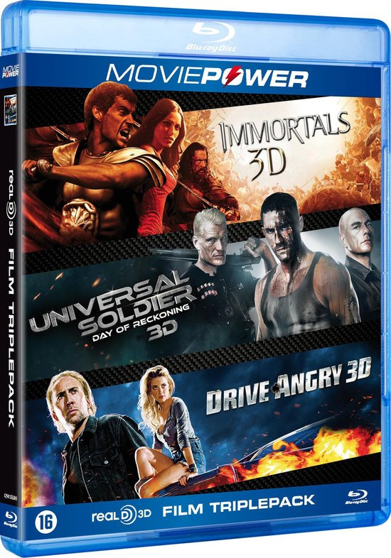 Artikelnummer: 8719372003312 OverzichtBox met drie actiefilms op Blu-ray: Immortals 3D, Universal Soldier 3D en Drive Angry 3D.